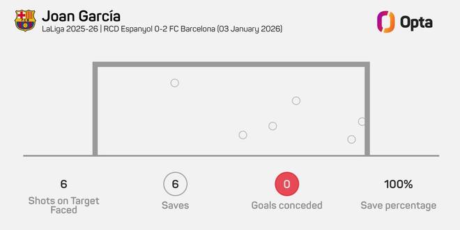 西甲第18轮,巴塞罗那客场2-0击败西班牙人,霍安-加西亚完成6次扑救,成为自2023年11月以来,首位在西甲零封比赛中6次扑救的巴萨门将。